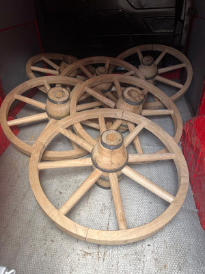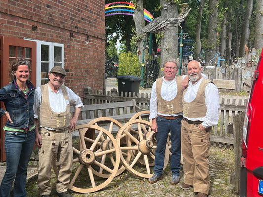 Auch an anderen Fronten ging es aktiv zu: Ein keltischer Wagen war bereits seit Frühjahr fertiggestellt, derzeit entsteht ein römischer Reisewagen, ein weiterer römischer Rennwagen folgt. Am Samstag, den 30. August, wurden dafür die Segmenträder, die in Eilaufträgen und in Kooperation mit dem Stellmachermuseum Langenrehm hergestellt wurden, aus Hamburg geliefert. In Kürze werden die Eisenreifen in einer öffentlich zugänglichen Aktion aufgeschrumpft, sodass bald die Tests der Wagen beginnen können.