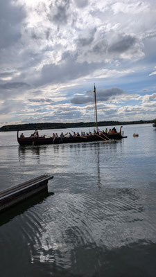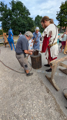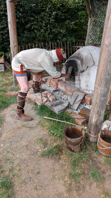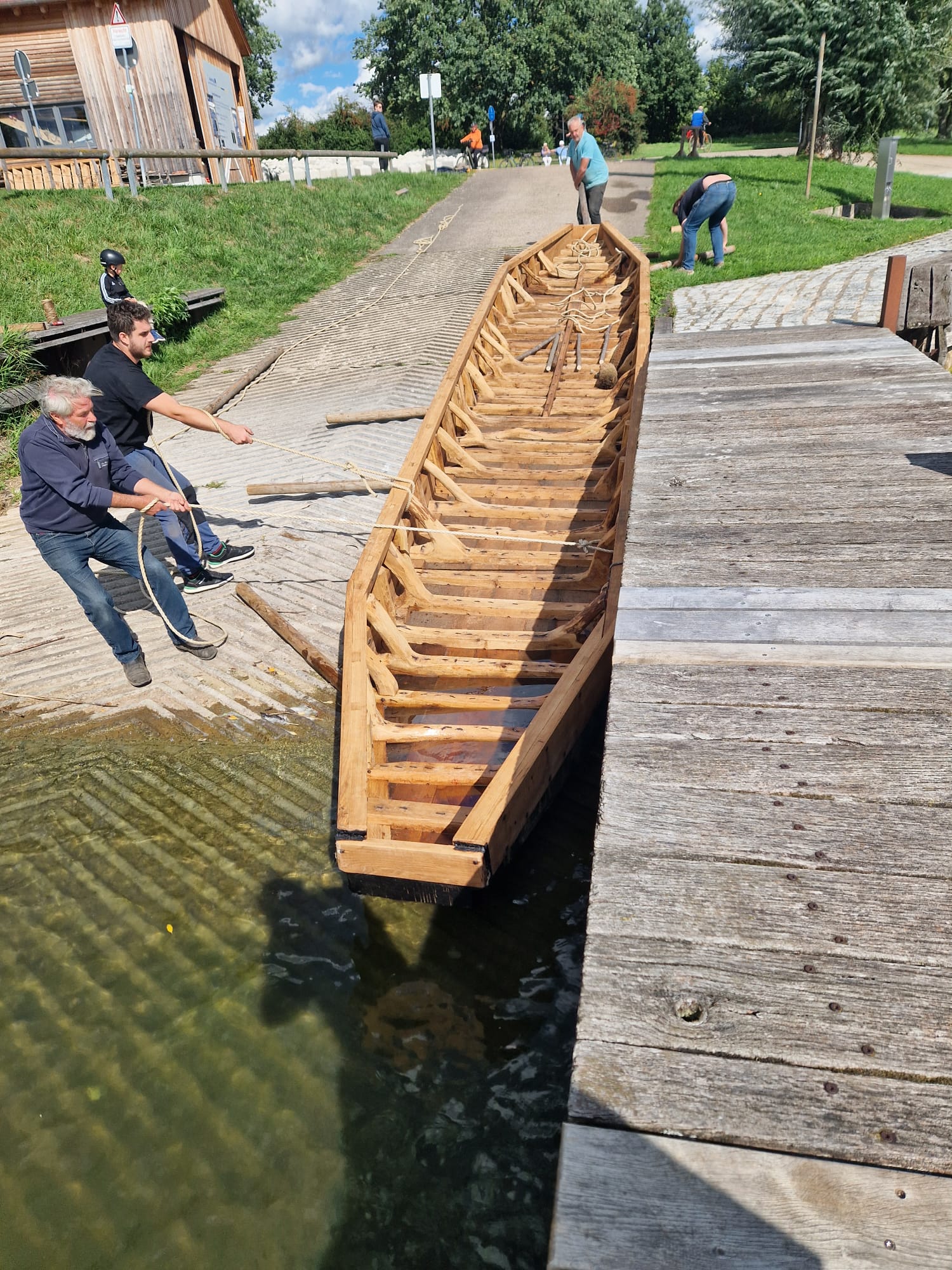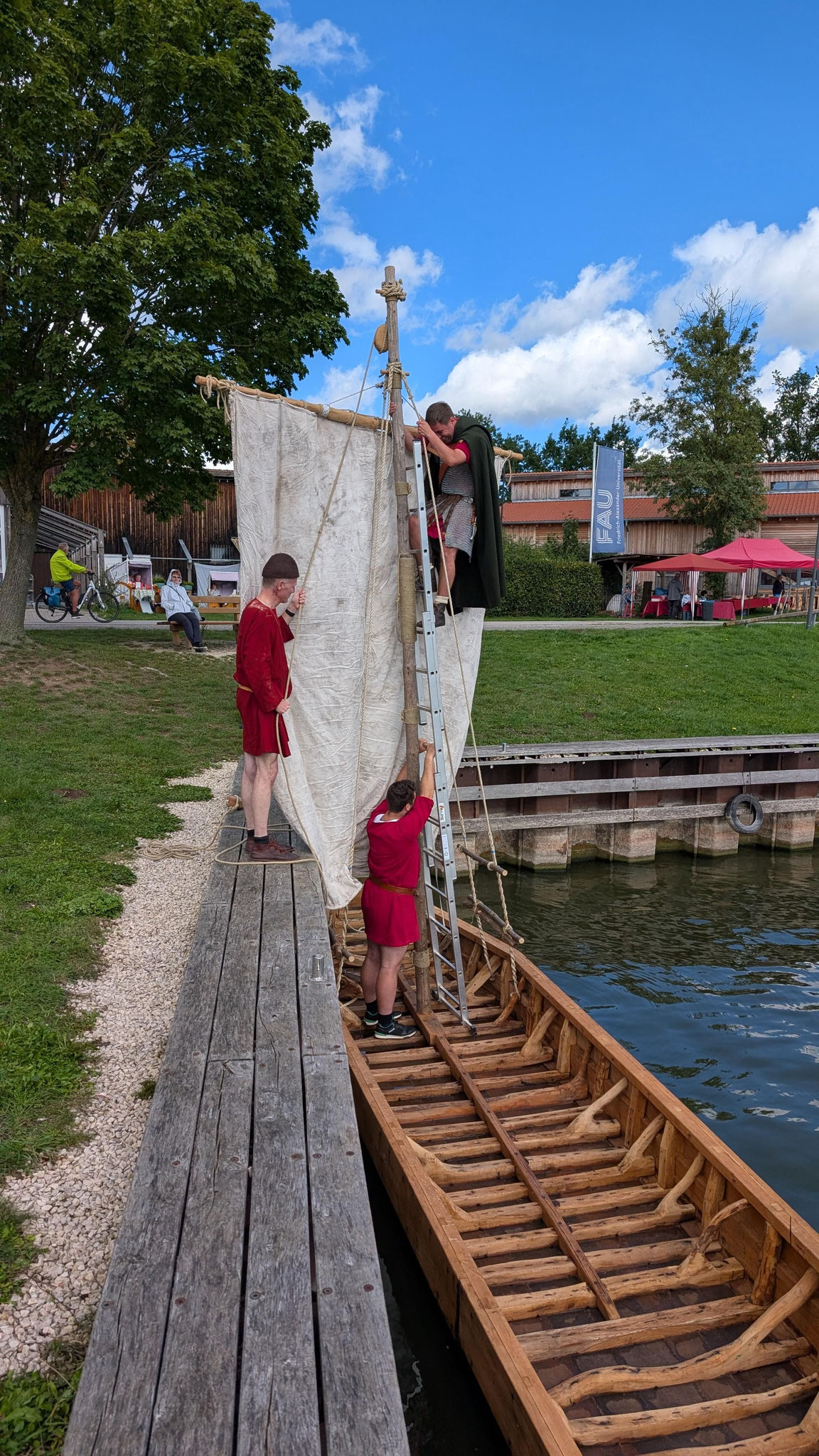 Im Römerzentrum am Altmühlsee beim rätischen Limes von Gunzenhausen ruhen die Aktivitäten nicht: Der Römische Nachmittag war erneut stark nachgefragt. Frisch im Römerofen gebackenes römisches Brot und andere Speisen erwarteten die Gäste, während geschmiedet und genietet wurde. In der Werft liefen derweil die letzten Arbeiten am neuen Prahmboot Alchmona rediviva, gebaut nach den Plänen von Zwammerdam II – Kalfaten, Teeren und das Einpassen des Mastes. Das Boot wird am 23. September gewassert, sobald auch die Danuvina, das römische Patrouillenboot der Spätantike, aus Südungarn von der Donau zurückkehrt und bei uns gewartet werden kann
