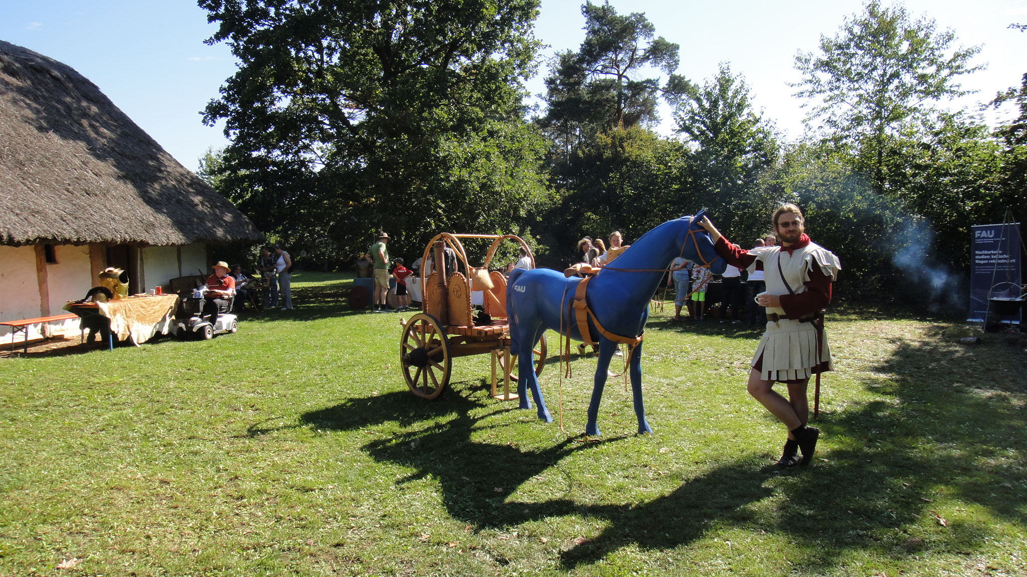 Nachmittags nahm das Institut mit dem neuen rekonstruierten Keltenwagen samt „Schlachtross“ am Schlossgartenfest teil. Das Projekt der Professur, das unter anderem hier auf der FAU Seite vorgestellt wurde, erwies sich als echter Publikumsmagnet.